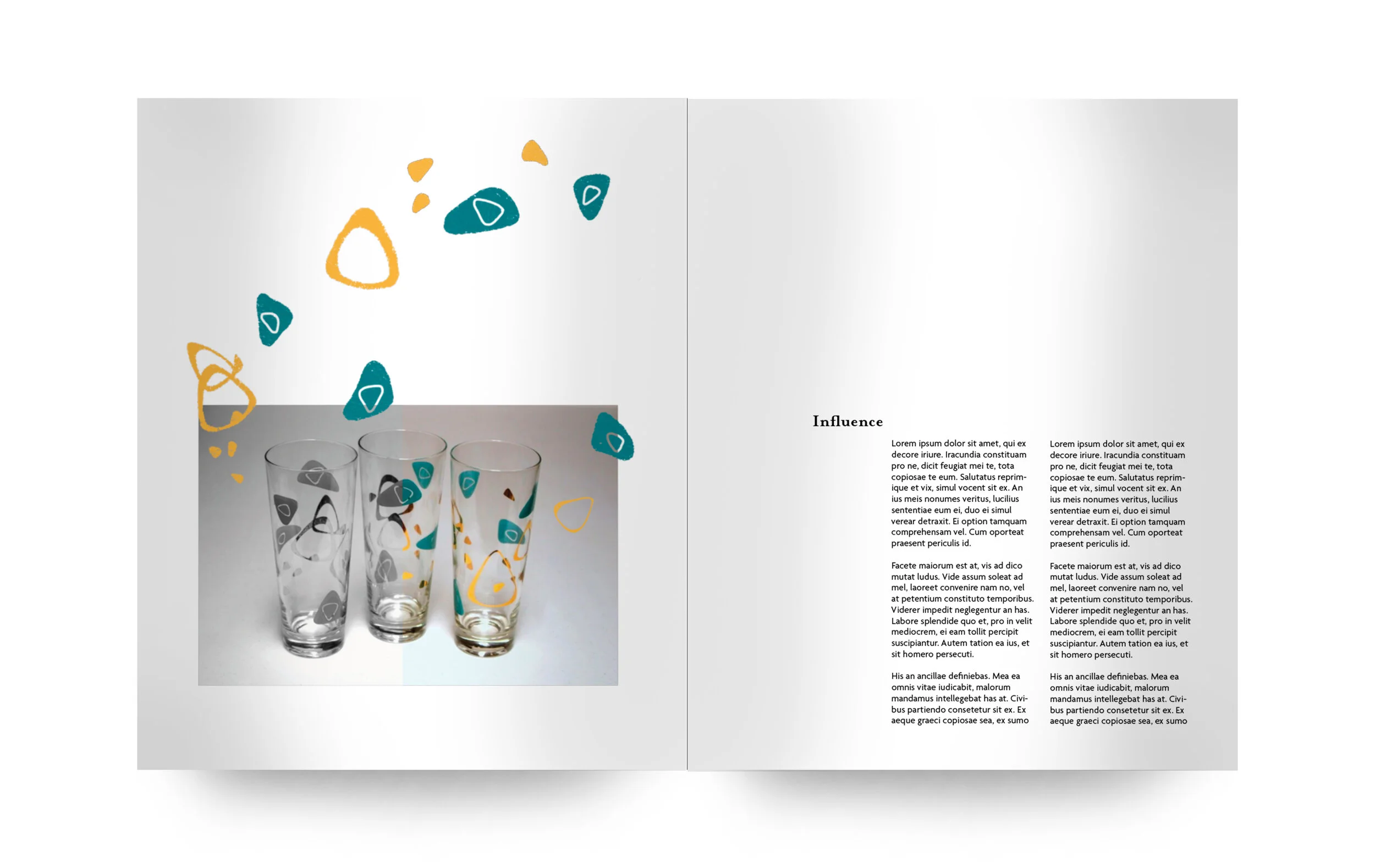 I have always admired editorial layouts, so when I got the opportunity to choose the topic of an editorial project, I wanted to create something that was close to my heart. Growing up, my grandmother had a cabinet full of all different types of pink cranberry glass from the Depression. I also remember sneaking candy out of an ornate milk glass container from her coffee table. Not many people know about vintage glassware, so I created this editorial to pay homage to my grandma and take the opportunity to create something modern and playful or of a subject that many people could find mundane.